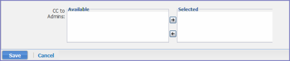 If you select one of the Admin options, a CC to Admins section is displayed in the dialog box. This section displays a list of devices. Under the Available heading , select a device (or devices), that is associated with an email address that you want to notify, other than the device user. Core will send a notification to the email address associated with the device or devices that appear under the Selected heading.