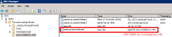 Create a DNS A record that refers DNS requests for enterpriseenrollment.YourCompanyDomainName.com to the MobileIron Core IP address.