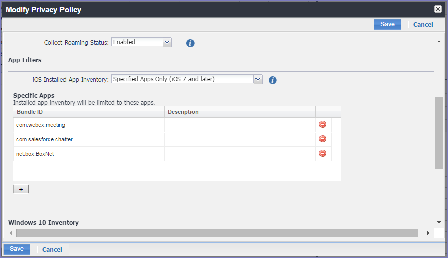 - Specified Apps Only (iOS 7 and later): Managed devices will send to Core the status of installed apps (whether iOS managed apps or unmanaged apps) with the specified identifiers (bundle IDs).