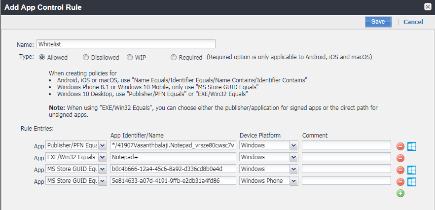 The figure below is an example of setting up a Whitelist App Control rule for Windows 10 Desktop, Windows 10 Mobile, and Windows Phone 8.1 devices.