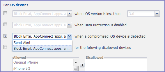 - Quarantine: block email access, block app tunnels, block AppConnect apps, and wipe AppConnect app data