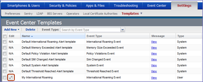 There are "Other" types of events that have templates that you can modify and use. The "Other" list includes the default template for: Action on Device, App Distribution, Selective Wipe, and Wipe. Default templates are not editable.