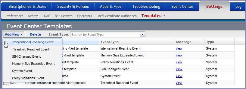 In the Event Center Templates page, you can filter messages by event type. Just select the preferred event type from the Event Type drop-down.