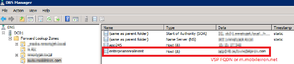 Create a DNS A record that refers DNS requests for enterpriseenrollment.YourCompanyDomainName.com to the Core IP address.