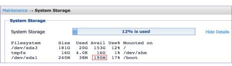 The System Manager > Maintenance > System Storage menu shows you how much Core system storage you are using, and how much is still available.
