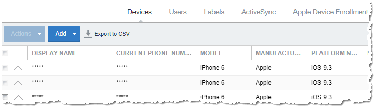 Once GDPR has been enabled for an admin or API user, they will not be able to see device and user information. When they navigate to Devices & Users > Devices, the GDPR fields display as asterisks, or a blank field.