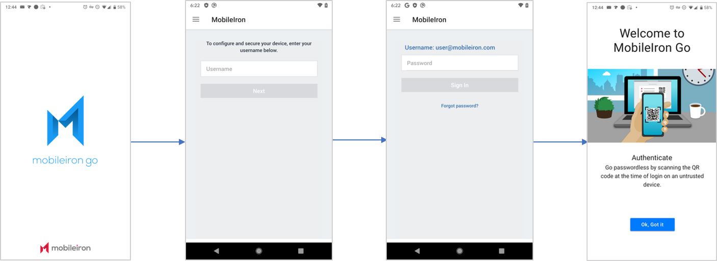 The following illustrates an example of the OTP workflow on an Android device using MobileIron Go.