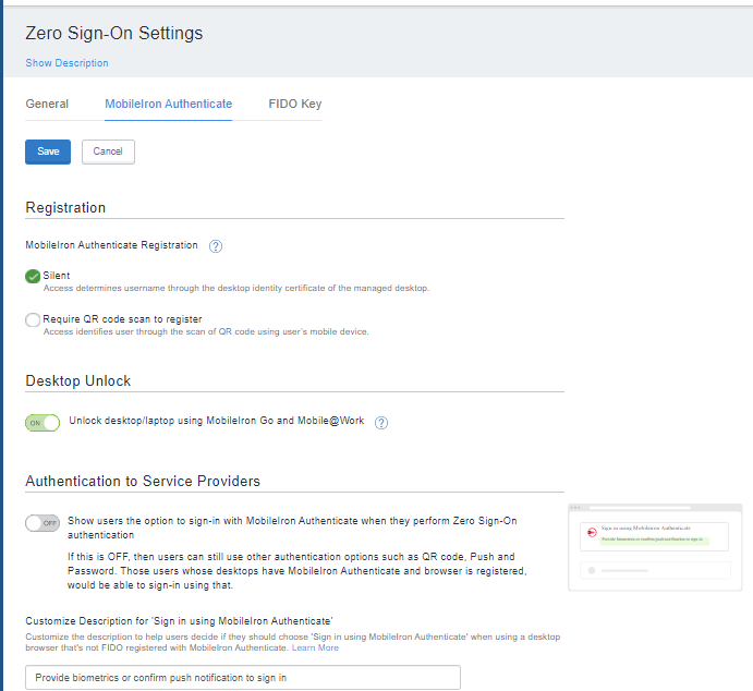 Desktop unlock is a secure and convenient method of unlocking user's desktop using a phone. The Authenticate application on the desktop works in conjunction with Access to send a push notification to the user's activated mobile phone to authenticate and unlock the desktop. Keep the toggle on in Profile > Zero Sign-on > Zero Sign-on Settings > MobileIron Authenticate to enable the feature.