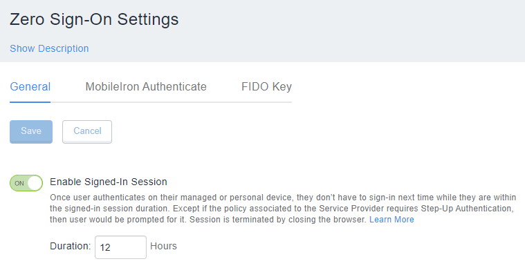 Click Zero Sign-on Settings> General to update the number of hours, if needed, for Enable Signed In Session.