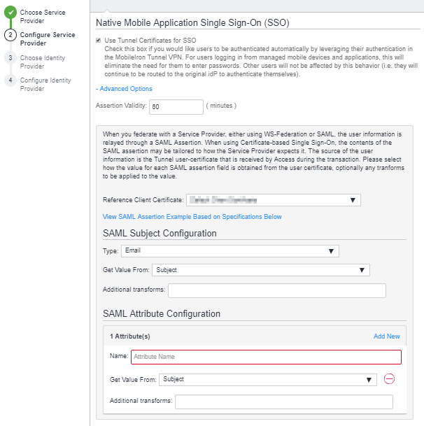 You created the user-friendly names when you added the sample Tunnel certificate to Access in the User Certificates tab. - (Optional) For Additional Transforms: Enter the required transforms if the SP expects values that are derived from the value provided in the certificate.