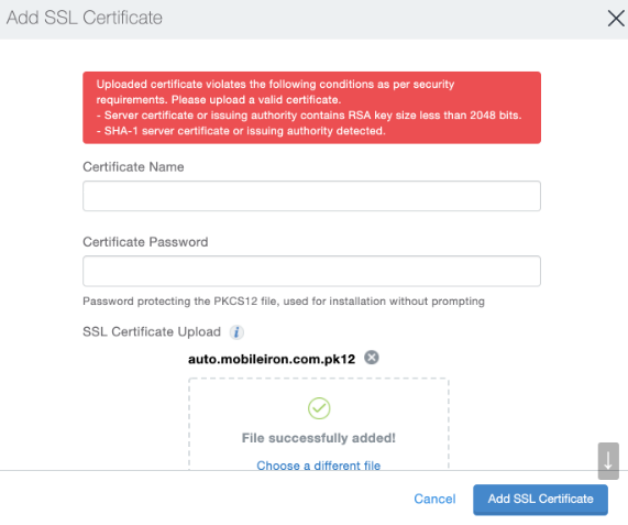 The certificate must comply with security requirements. See Error conditions for SSL certificate. For more information about error conditions, see Adding a profile . If the SSL certificate does not comply with the security requirements, then the following error displays.