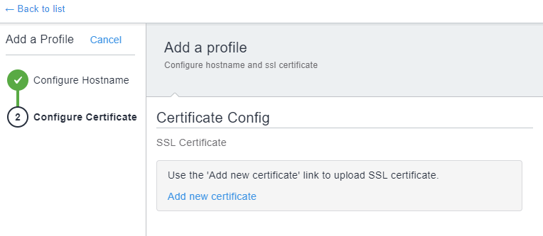| 3. | Click Add new certificate to upload the SSL certificate associated with the second hostname. |