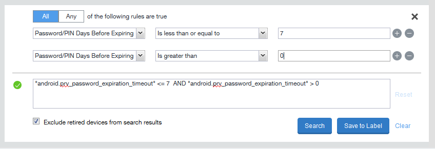 Using Advanced searching, create a search that searches for devices that are less than 7 days (for example) of the device's password expiration date. Utilize the Android > Password/PIN Days Before Expiring field as part of your search criteria.