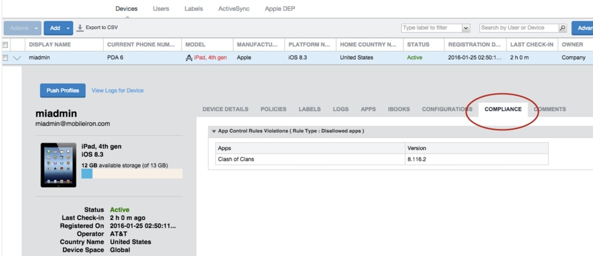 Click the caret next to the device entry to open the device details pane. Click Compliance to see the app control status information.