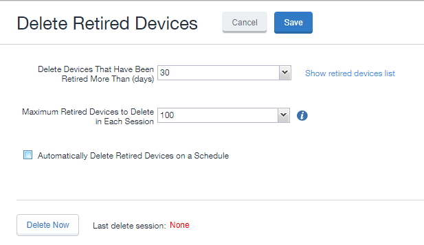 - Optional. Select the maximum retired devices to delete in each session, or accept the default of 100 devices.