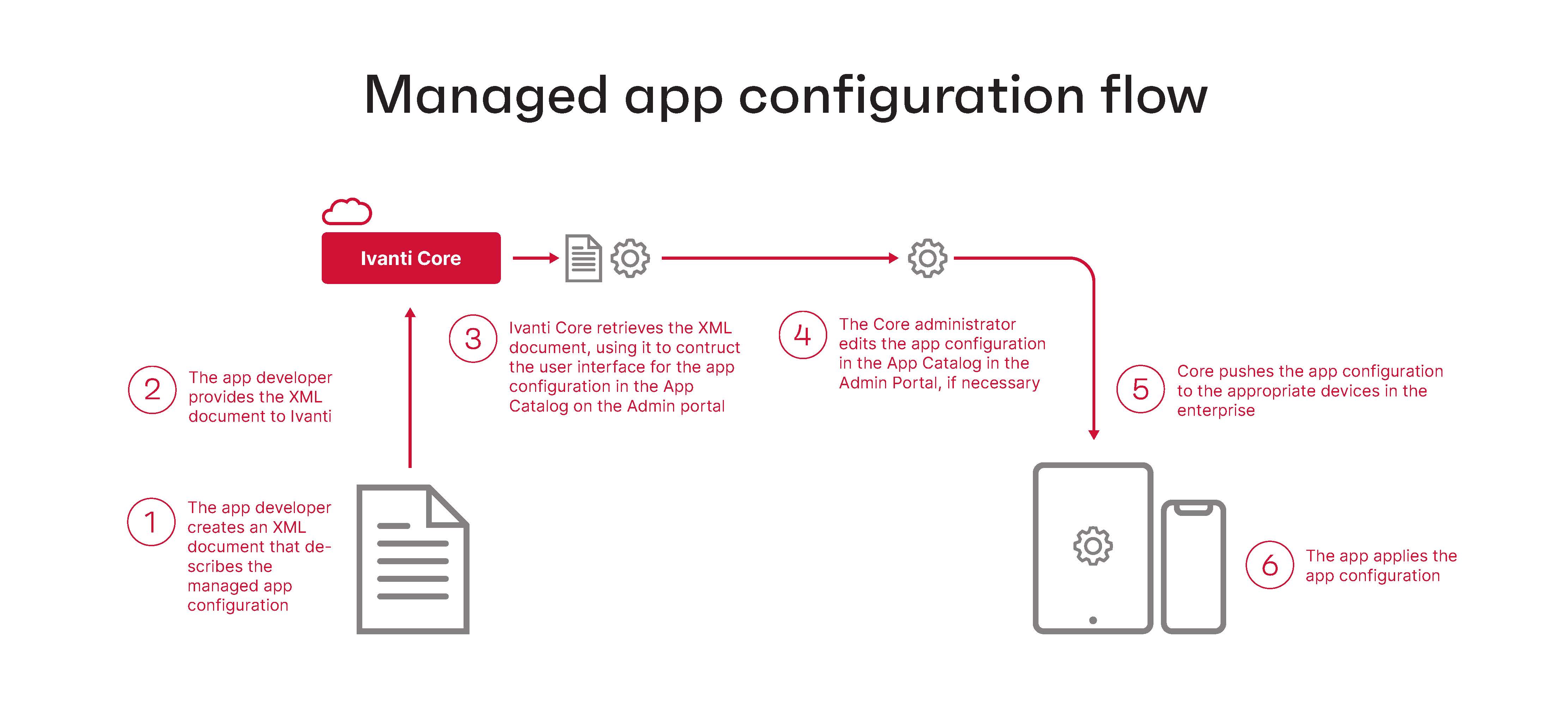 This mechanism supports the iOS managed app configuration defined in the AppConfig Community at appconfig.org. Working with Core, many registered Ivanti Technology Partners who are deploying their apps to the Apple App Store support this mechanism to make their apps easier to deploy in enterprises. This mechanism works as follows: