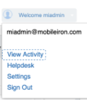 Ivanti Mobile@Work users can access their audit/device history logs from the self-service user portal. From the user portal Welcome drop-down menu, select View Activity. The device activity page opens, displaying search tools and a scrolling table of log entries. Users can access this page from their laptop and mobile devices.