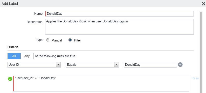 The Display Name field on the "Add a label" page changes to reflect the user logged in. This is how the Filtered Label distinguishes which Kiosk Policy is applied.
