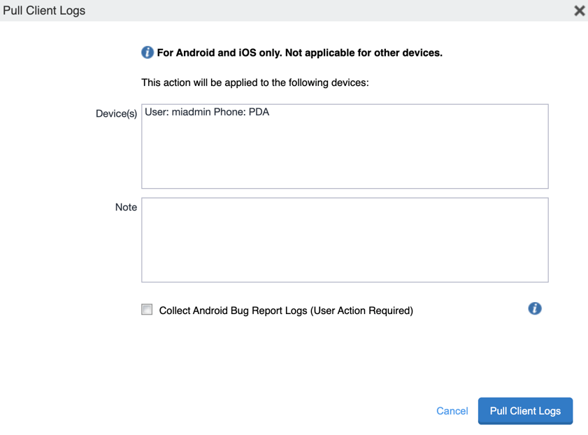 - Select Pull Client Logs. The Pull Client Logs dialog box displays. The Devices field displays the name of the device that you selected. You cannot add additional devices here.