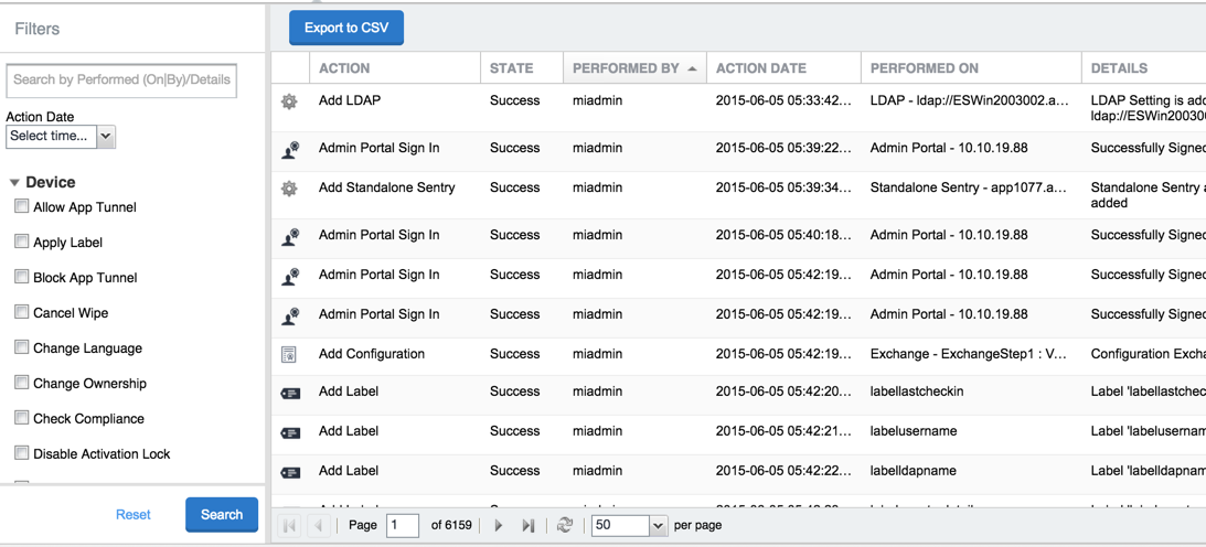 The Audit Logs page displays the information that Ivanti EPMM records for your Ivanti EPMM instance. You specify what information is displayed on this page when you use the controls in the Filters panel of the page. See Searching the information in the audit logs for details.