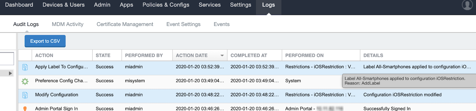 This MDM log information is also provided in the Logs > MDM Activity tab.
