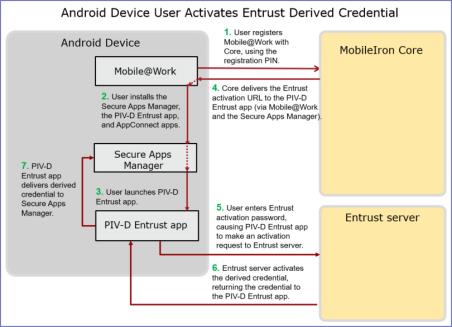 For Android devices, install the Secure Apps Manager for Android on the device, followed by the PIV-D Entrust app, and any AppConnect apps. |