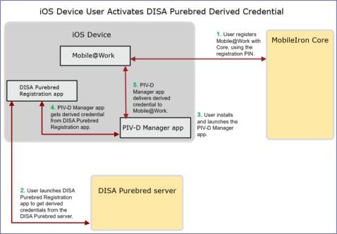 The following diagram displays the what happens when the device user gets a DISA Purebred derived credential.