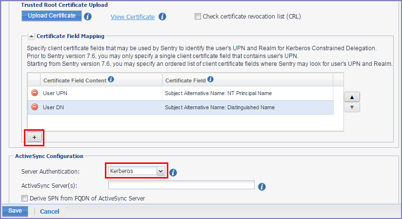 | 4. | When you select for Identity Certificate for Device Authentication, the Certificate Field Mapping section appears. Use this section to specify the certificate fields that Standalone Sentry can use to derive users’ UPN and Realm for Kerberos authentication. You can specify multiple certificate fields. |