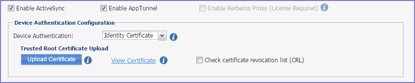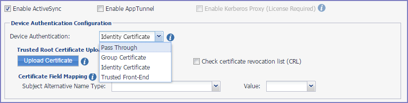 If you do device authentication with Identity certificates, you can specify different server authentication types for the ActiveSync configuration and for each AppTunnel service. For example, you can specify Pass Through for the ActiveSync server and Kerberos Constrained Delegation (KCD) for the servers listed for an AppTunnel service.
