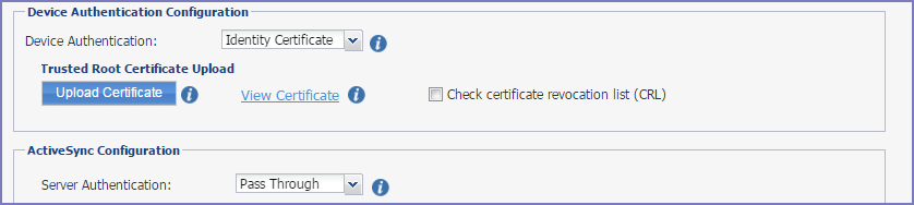 This section describes the configuration when you choose Identity Certificate to authenticate the device to Standalone Sentry and Pass Through for how Sentry authenticates the device to the ActiveSync server or a backend resource.