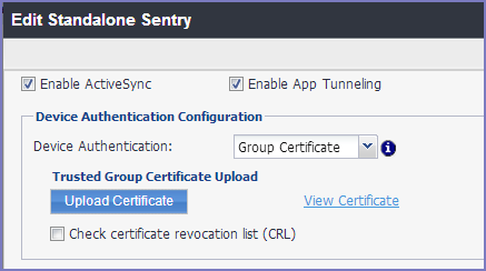 You specify the device and server authentication in the Sentry configuration under Services > Sentry in the Admin Portal. Click Add New > Standalone Sentry or click the Edit icon for an existing Sentry.