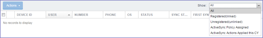 To filter the devices displayed in the ActiveSync page in the Admin Portal (Devices & Users > ActiveSync), select one of the criteria in the drop-down list for Show.