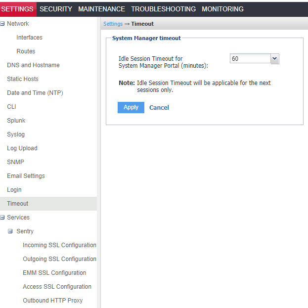 Use the Timeout page to configure the idle session timeout for Sentry System Manager. You can set the timeout for up to 90 minutes.