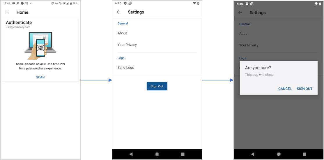 The following figure provides an example of the workflow on an Android Authenticator Only device when using passwordless authentication.