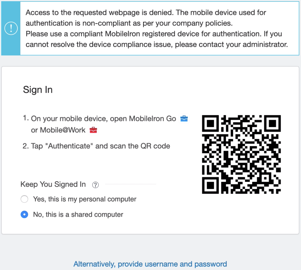 In a Authenticator Only deployment, if users scan the QR code with a Authenticator Only device that is out of compliance, an out of compliance message is presented. Ivanti Access to the enterprise cloud service is not granted. A new QR code is presented to the user. Users can switch to a compliant Authenticator Only device to authenticate.