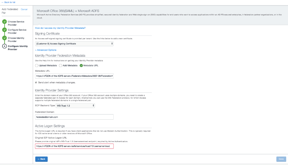 If your IdP is Microsoft ADFS, the Original IDP Active Logon URL text box is pre-populated with the Active Logon URL. Update the URL with the correct ADFS domain.