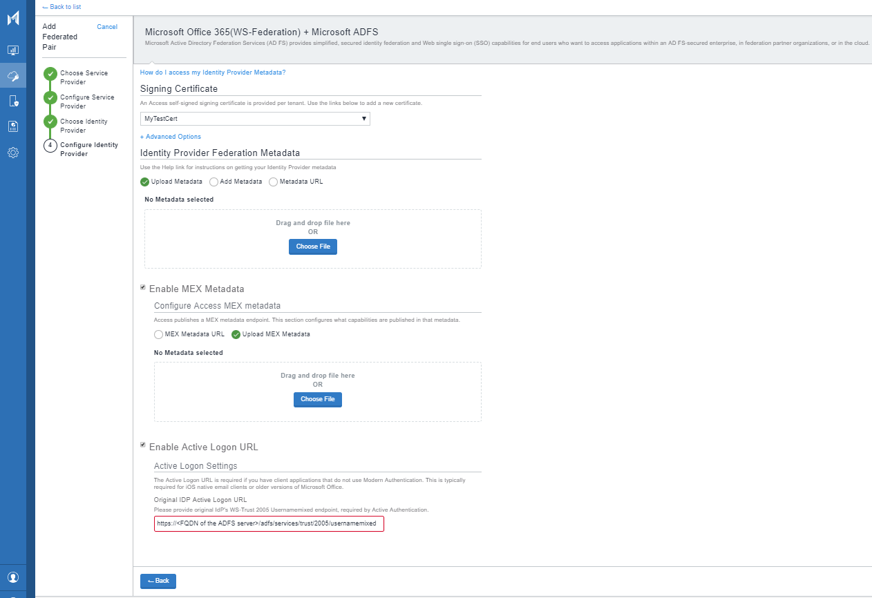 - MEX metadata URL: Enter the URL for the MEX metadata for the original IdP.