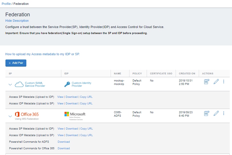 The commands to federate Azure AD with Ivanti Access are provided as a PowerShell batch script, which can be downloaded from the Ivanti Access administrative portal. After you create a federated pair with Office 365 in Access, the link to download the PowerShell batch script becomes available in the federated pair listing in Profile > Federated pairs.