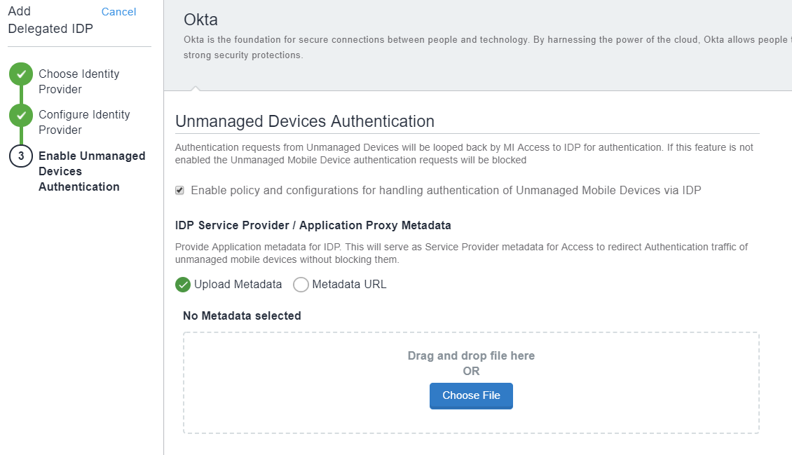 - (Optional) For Okta or PingFederate, if you enabled Unmanaged Device Authentication, upload the IdP metadata downloaded from the respective IdP.