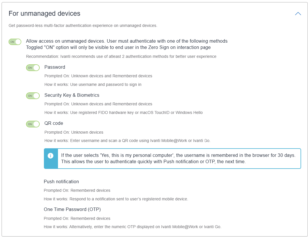 - For unmanaged devices: Enable the toggle switch to allow admins to independently manage the authentication methods. Users are authenticated with one of the following methods: Password, Security Key & Biometrics, QR code, Push notification and One Time Password (OTP).
