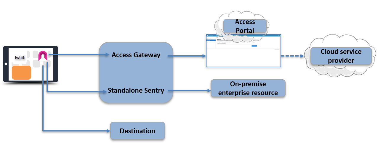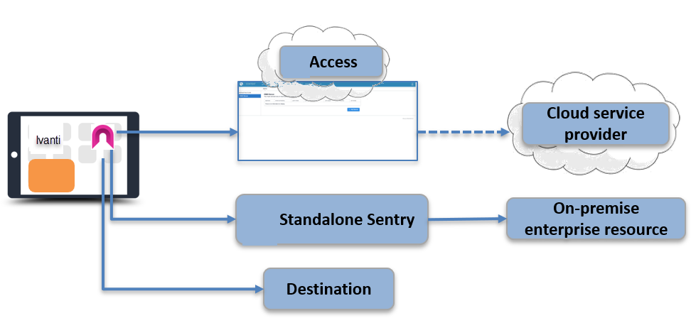 In an Ivanti Access deployment, all authentication traffic for the federated pairs configured in Access goes through Access using Tunnel VPN. Depending on the type of Ivanti Access deployment, all other traffic through Tunnel VPN goes directly to the destination server or through Standalone Sentry. Split tunneling allows you to control which traffic goes through Standalone Sentry to on-premise enterprise resources and which traffic goes directly to the destination.