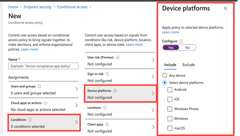 条件をクリックし、[デバイス プラットフォーム] をクリックします。 適切なデバイスプラットフォームを選択します。