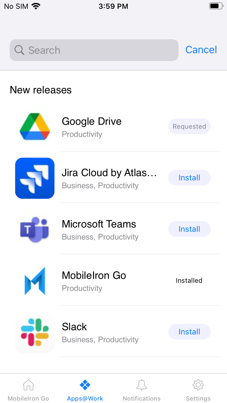 2. Apps@Work アイコンをタップします。[すべてのアプリケーション] と [カテゴリ] という2つの既定のタブを使用できます。