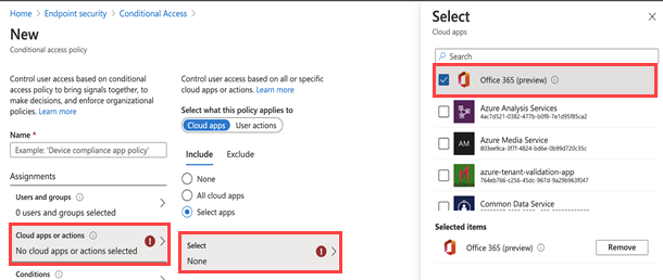 6. [クラウド アプリまたは操作] をクリックし、[選択] をクリックします。 保護する必要のあるアプリを検索し、選択します。