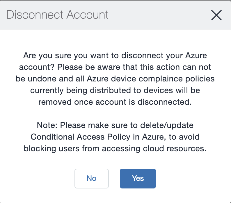 管理者が Ivanti Neurons for MDM で連携解除を実行すると、Ivanti Neurons for MDM はAzureへのデバイスインベントリおよびコンプライアンス状態の報告を停止します。