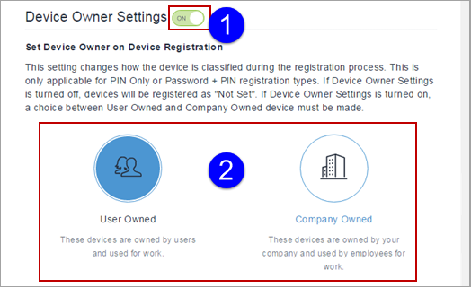 14. [デバイス所有者設定] をオンにし、[ユーザ所有] または [会社所有] をクリックすることも可能です。 この設定は登録プロセス中にデバイスの分類を変更します。