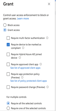 In the New conditional access policy page > Access controls, click Grant and make the access and block selections.