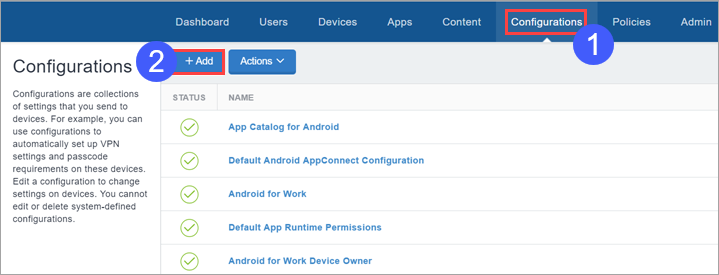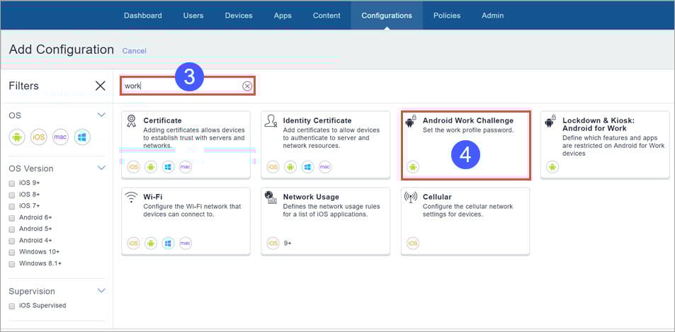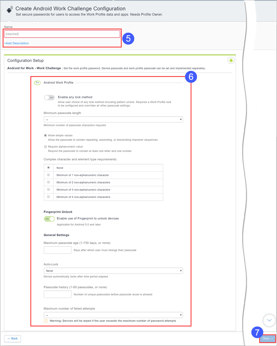 An Android Work Challenge configuration defines secure passwords for users to access the Work Profile data and apps. Requires Android Enterprise Work Profile.