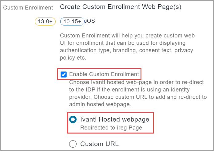 To configure an identity provider to work for registering Apple Business Manager iOS and macOS devices, you must enable the Enable Custom Enrollment and the related Ivanti Hosted webpage settings found at Admin > Apple > Device Enrollment > edit a device enrollment profile. See Device Enrollment for more information: