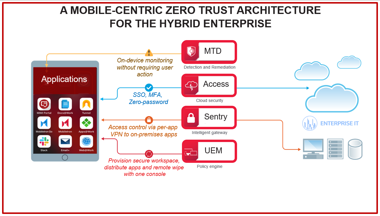 The Ivanti solution to this modern problem meets all the challenges. You can monitor endpoints and trigger adaptive policies to remediate threats, quarantine devices, and maintain compliance. Together, the following components help your organization realize the mobile-centric zero trust framework: